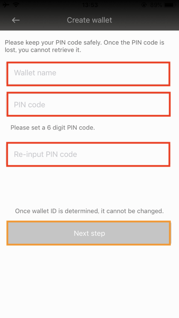 4. 「Wallet name」にウォレットの名前、「PIN code」には好きな6桁の数字を入れ、「Re-input PIN code」に再度同じ6桁の数字を入力し、「Next step」の色が変わるので、クリックします。