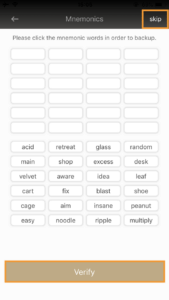 6. 先ほどの24個のワードを左から順に入れていきます。面倒な場合は右上の「skip」を押して飛ばすことも可能です。