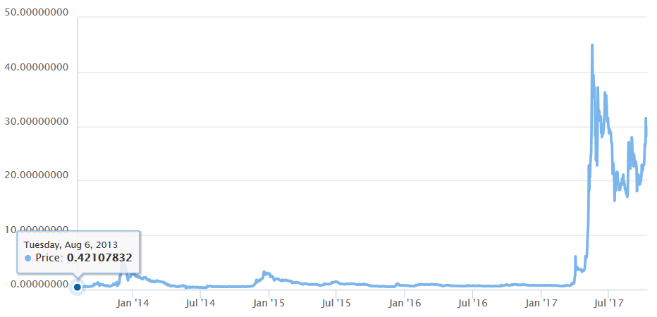 XRPの値段は、2013年8月には0.4円程度であった金額から、2017年に最高値を記録した際に40円を超え、100倍以上の値段になっています。これは、先に述べた、リップル(Ripple)(XRP)の将来性や、各大手金融機関が提携を進めたことで、第二のビットコイン候補としての思惑が高まり、大きく買われたものと思われます。
